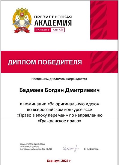 Всего на конкурс поступило 211 работ, из них 169 – это эссе, выполненные студентами образовательных организаций высшего образования. В мероприятии приняли участие представители из 33 различных учреждений высшего образования. Поступили творческие работы студентов из Москвы, Санкт-Петербурга, Новосибирска, Екатеринбурга, Казани, Иркутска, Рязани, Калининграда, Владимира, Воронежа, Томска, Саратова, Омска, Перми и Пскова. В состав жюри конкурса вошли преподаватели кафедры частного права, кафедры судебной, административной и прокурорской деятельности, кафедры теоретико-исторических и государственно-правовых дисциплин Алтайского филиала Президентской академии и приглашенные эксперты по разным тематикам конкурса. В направлении гражданское право 1 место в номинации «За оригинальную идею» занял студент 3 курса Бадмаев Богдан. В направлении прокурорский надзор (вузы) 1 место заняла студентка 5 курса Якубова Халиде. В направлении права человека 1 место в номинации «За актуальность исследования» разделили между собой студент 2 курса Сердюк Сергей и студентка 4 курса Биган Анна.