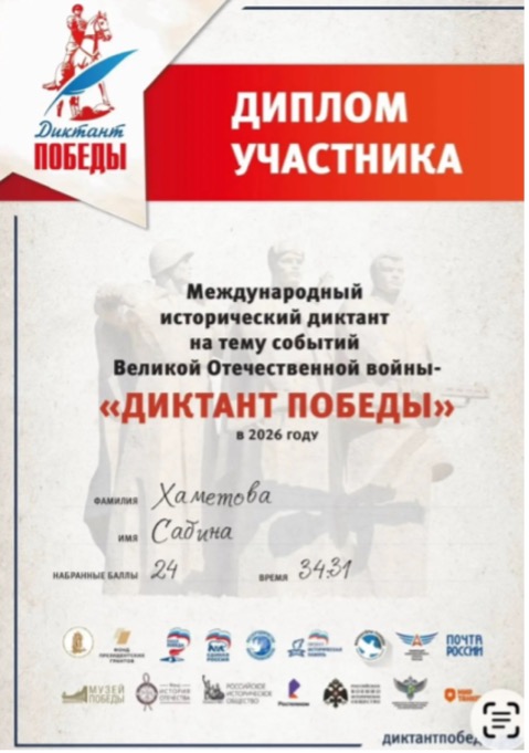 «Диктант Победы» – это акция, которая проводится с 2019 года в рамках проекта «Историческая память» партии «Единая Россия». Основная цель акции – сохранение исторической памяти о Великой Отечественной войне, формирование патриотического сознания и противодействие попыткам фальсификации истории. В 2026 году акция посвящена 130-летию со дня рождения маршала Советского Союза Георгия Жукова и 85-летию начала Великой Отечественной войны. «Диктант Победы» стал не только проверкой знаний, но и масштабной гражданской акцией, объединяющей людей вокруг общей идеи – сохранения исторической правды и памяти о подвиге советского народа в годы войны. Участие в диктанте способствует укреплению патриотизма и исторической идентичности, особенно среди молодёжи.