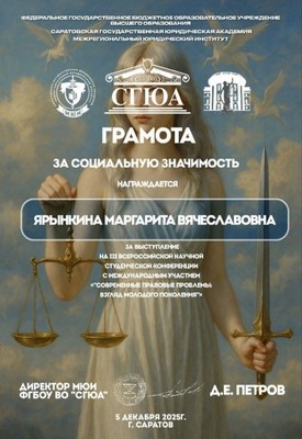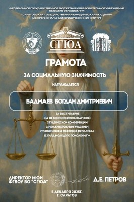 В организационный комитет было подано рекордное количество заявок — более 560. География события впечатлила своим размахом: в конференции участвовали представители более чем 30 регионов России, а также зарубежные коллеги. Молодые ученые представили доклады по самым актуальным вопросам современного права, продемонстрировав глубокий анализ и свежий взгляд. По итогам конференции в секции «Актуальные проблемы трудового права и права социального обеспечения» грамотами за победу в номинации «За социальную значимость» награждены студенты 3 курса Бадмаев Богдан и Ярынкина Маргарита, вступившие с темой «Актуальные проблемы трудоустройства лиц с ограниченным возможностями здоровья», научный руководитель - доцент кафедры гражданско-правовых дисциплин Борецкая Лилия Романовна.