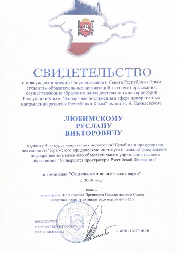 6 февраля 2026 года студент Крымского юридического института (филиала) Университета прокуратуры Российской Федерации Любимский Руслан принял участие в торжественной церемонии награждения представителей научного сообщества, приуроченной к празднованию Дня российской науки в Государственном Совете Республики Крым. Мероприятие открылось поздравительной речью первого заместителя Председателя Государственного Совета РК Андрея Козырева, заместителя Председателя ГС РК Натальи Звёнзек и председателя Комитета по образованию и науке Елены Крестьяниновой.