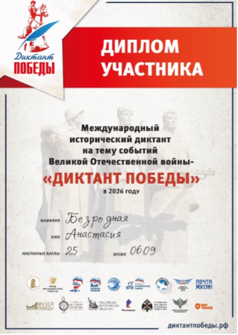 «Диктант Победы» – это акция, которая проводится с 2019 года в рамках проекта «Историческая память» партии «Единая Россия». Основная цель акции – сохранение исторической памяти о Великой Отечественной войне, формирование патриотического сознания и противодействие попыткам фальсификации истории. В 2026 году акция посвящена 130-летию со дня рождения маршала Советского Союза Георгия Жукова и 85-летию начала Великой Отечественной войны. «Диктант Победы» стал не только проверкой знаний, но и масштабной гражданской акцией, объединяющей людей вокруг общей идеи – сохранения исторической правды и памяти о подвиге советского народа в годы войны. Участие в диктанте способствует укреплению патриотизма и исторической идентичности, особенно среди молодёжи.