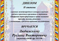 Студенту 4 курса Любимскому Руслану Викторовичу за исследование на тему «Государственная политика по обеспечению социально-экономических прав участников специальной военной операции: правовые основы..